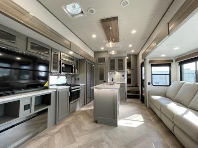 You will find residential style seamless marbled countertops, Dyna Span marine grade decking, residential style screwed and glued cabinetry, and designer upholstered window valances to make you feel right at home. The MaxTurn technology with Road Armor will make for smooth towing and the automotive-grade painted fiberglass front cap includes KeyShield protection for added convenience.