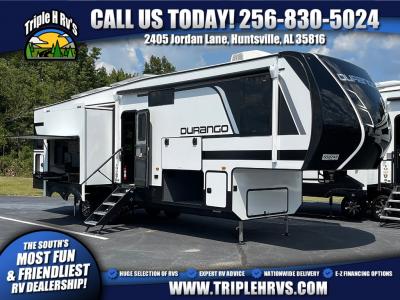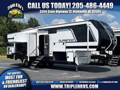 Enjoy full time living, an affordable price, and a wide body construction for more living space with every one of these KZ Durango light high-profile fifth wheels! These luxury units can be used all year round with the all-weather insulation package, the 3" x 14" foam-core in-floor straight-line heating system with a 35,000 BTU furnace, and the 15,000 BTU ducted roof A/C which optimizes the airflow by an average of 40% for better performance, cooling time, and reduction of noise. A few other construction features you will appreciate include a one piece, seamless walk-on Tufflex roofing material, Pex® in-floor heated waterlines, and a Lamilux® gelcoat fiberglass exterior. Inside, blancher maple & morel fog cabinetry , a king size bed, and smart TVs will have you feeling like you never left home!