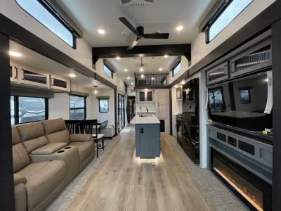 Wherever your destination may be, you can be sure to enjoy it to the fullest with this trailer in tow! With two entry doors, you can enter in through the rear private bedroom or the main living area. The bedroom includes a king bed slide out, a wardrobe/closet to keep your clothes organized, plus a closet with the option to add washer and dryer prep. Just outside this room are steps that lead to the large loft area with a 58" x 58" bunk mat and a cabinet on one side, plus two 32" x 69" bunk mats on the other. There is also a cabinet and a wardrobe/closet for plenty of storage space. Once you've headed back downstairs, you can relax on the dual recliners, front sofa, or free-standing table with a bench and two seats. And the chef of your group will love the kitchen with its residential style refrigerator and pantry, kitchen island, and four burner cooktop!