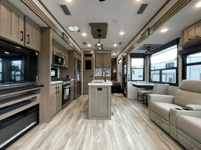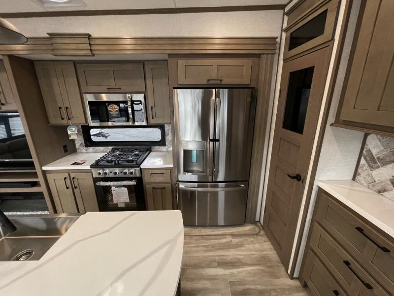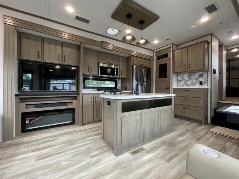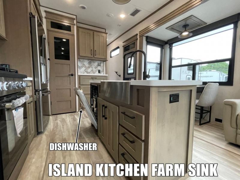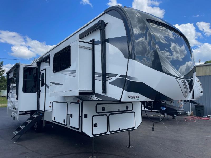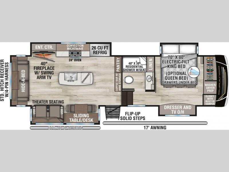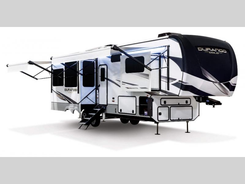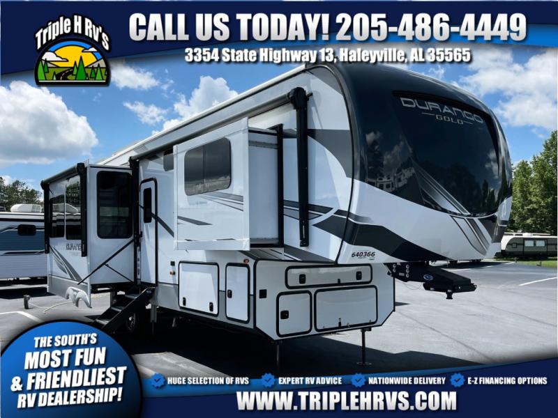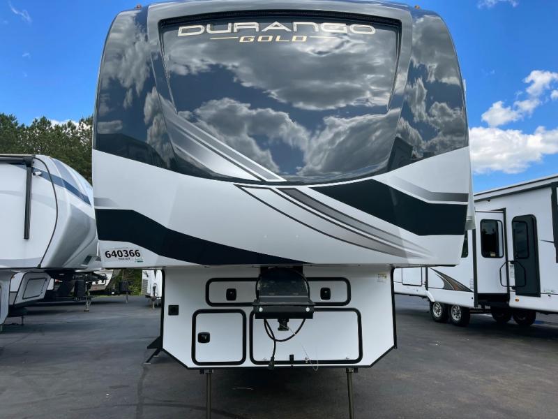 Camp wherever you want and stay as long as you desire with this full-time fifth wheel! You will love the spacious interior which includes a front bedroom with an electric tilt king bed slide with drawers underneath, a front wardrobe with washer and dryer prep, a closet with a built-in hamper, plus a slide out dresser with 32" Smart LED TV above. The full bathroom offers a residential shower with a seat plus linen storage, and the kitchen gives the cook a dream kitchen that includes a farmhouse stainless steel sink and dishwasher in the center island, a 22 cu. ft. house refrigerator with a 2,000W inverter, and more. The 50" Smart LED TV with a fireplace below can be seen from the legless table and chairs, the comfortable theater seats and the hide-a-bed sofa. Yet you might like to add the full-timer's desk option, and there are more options to customize your Durango Gold.