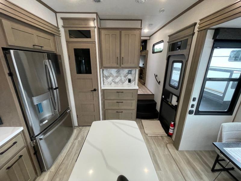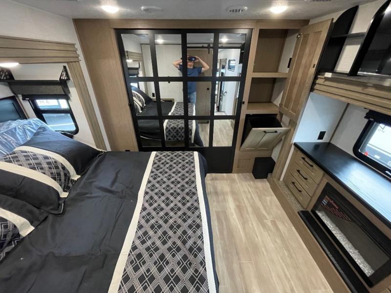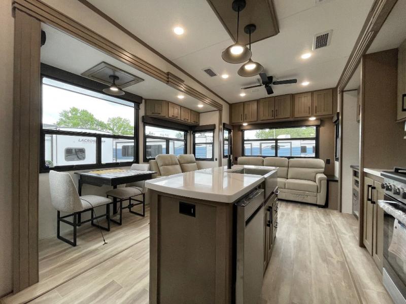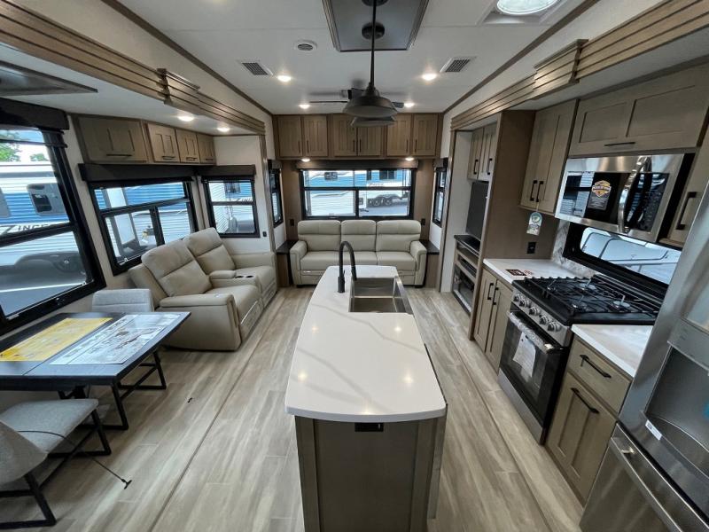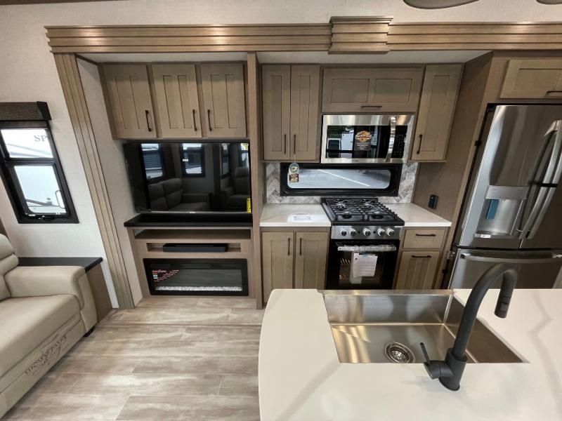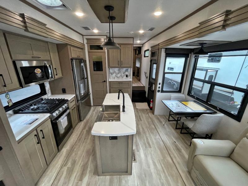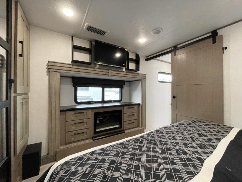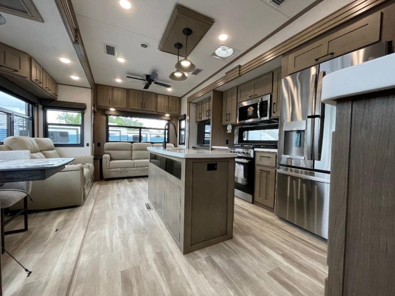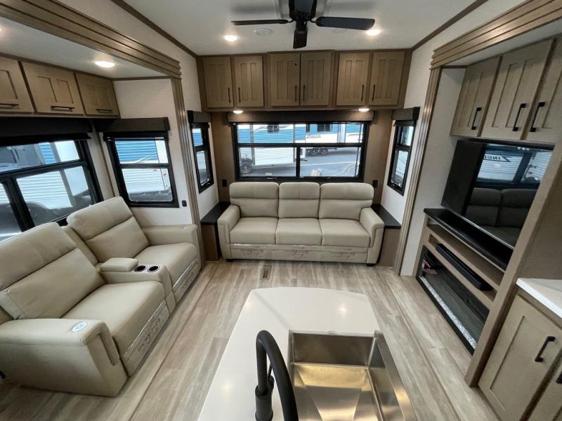 Camp wherever you want and stay as long as you desire with this full-time fifth wheel! You will love the spacious interior which includes a front bedroom with an electric tilt king bed slide with drawers underneath, a front wardrobe with washer and dryer prep, a closet with a built-in hamper, plus a slide out dresser with 32" Smart LED TV above. The full bathroom offers a residential shower with a seat plus linen storage, and the kitchen gives the cook a dream kitchen that includes a farmhouse stainless steel sink and dishwasher in the center island, a 22 cu. ft. house refrigerator with a 2,000W inverter, and more. The 50" Smart LED TV with a fireplace below can be seen from the legless table and chairs, the comfortable theater seats and the hide-a-bed sofa. Yet you might like to add the full-timer's desk option, and there are more options to customize your Durango Gold.