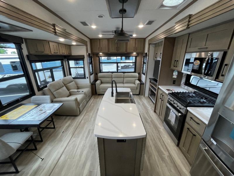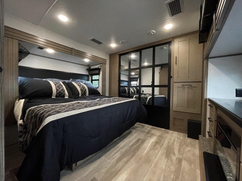 With any KZ Durango Gold full-time luxury fifth wheel, you will enjoy the new Blancher Cherry cabinetry, stainless steel appliances such as a 30" convection microwave and 24" oven with a four burner range, plus a stainless dishwasher. Other top features include an electric tilt bed with Serta Comfort foam king mattress, two 15K A/C units, plus theater seating with powered recline, heat and massage features. You will also appreciate a handy central vacuum system with attachments that stores out of sight. Each Durango Gold is constructed with six-sided aluminum framing, and has a heated, insulated and an enclosed underbelly. It is also constructed with Tufflex roofing material which is flexible, puncture resistant, and reflective. The now standard "Off The Grid" solar package includes two 200W solar panels, a 30A MPPT solar charge controller, and a 2,000W True Sine Wave inverter for off-grid capabilities. If you're wanting to go completely off-grid, you might want to choose the optional Boondocker Solar System with even more features that won't require you to be close to electric hookups!