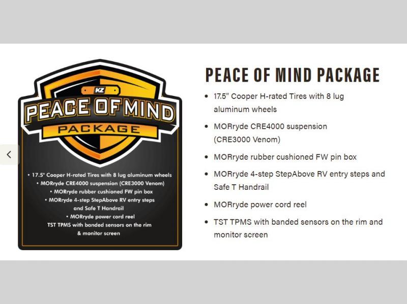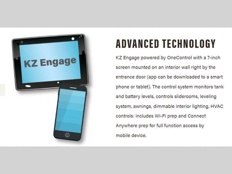 - KZ Engage Powered by OneControl (control system monitors tank levels & battery levels, controls slide rooms, leveling system, awnings, dimmable interior lighting, HVAC controls: includes Wi-Fi prep & Connect Anywhere prep for full function access by mobile device)
