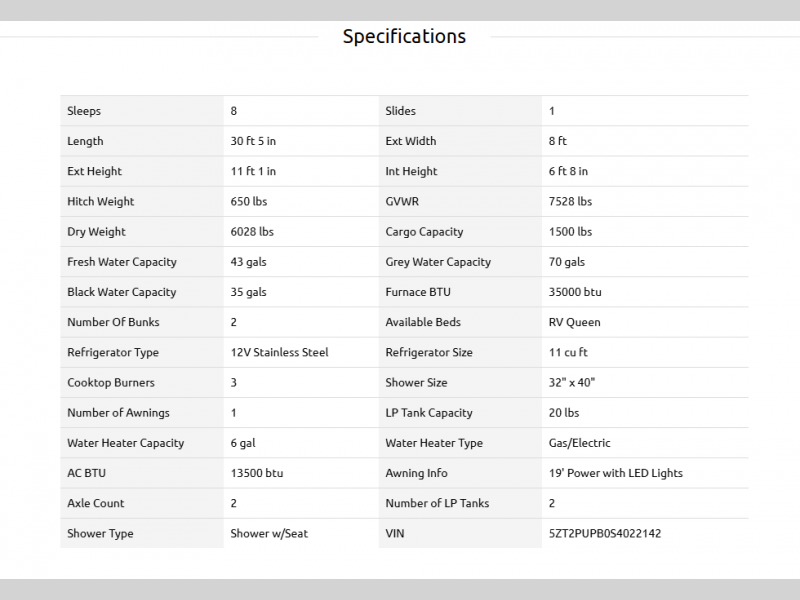 Triple H RVs - Strives to ensure all pricing, images and information contained in this website is accurate. Despite our efforts, occasionally errors resulting from typos, inaccurate detail information or technical mistakes may occur. We are not responsible for any such errors and reserve the right to correct them at any time. Stock photos may not represent actual unit in stock. See dealer for details. **Triple H RVs does not offer refunds or exchanges on products we sell. Customer would have to contact the manufacturer.